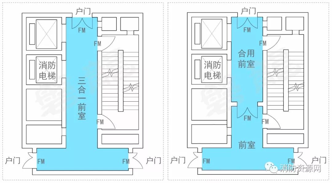 2014版《建筑设计防火规范》(简称《建规》),提出了“三合一前室短边不应小于2.4m”以及“每层开向同一前室的户门不应大于3樘”的要求。“前室穿套”作为一种规避规范条文取巧措施,得以发展应用: