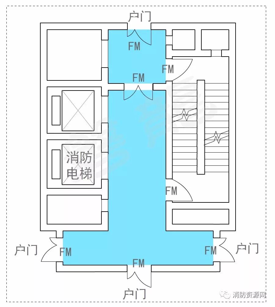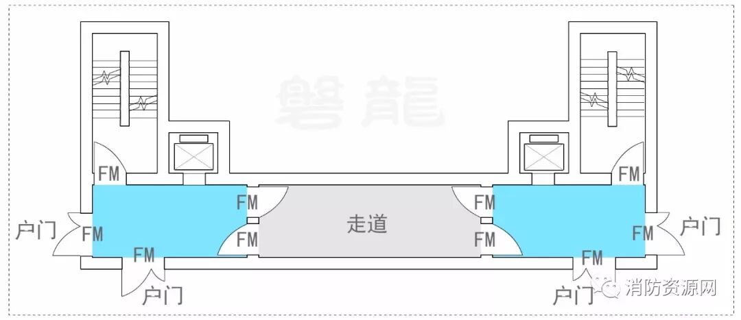 2、错误示例(示例4):本示例中,户门对前室开启,通过走道连通,而且在连通部位设置两樘独立的不同疏散方向的防火门。