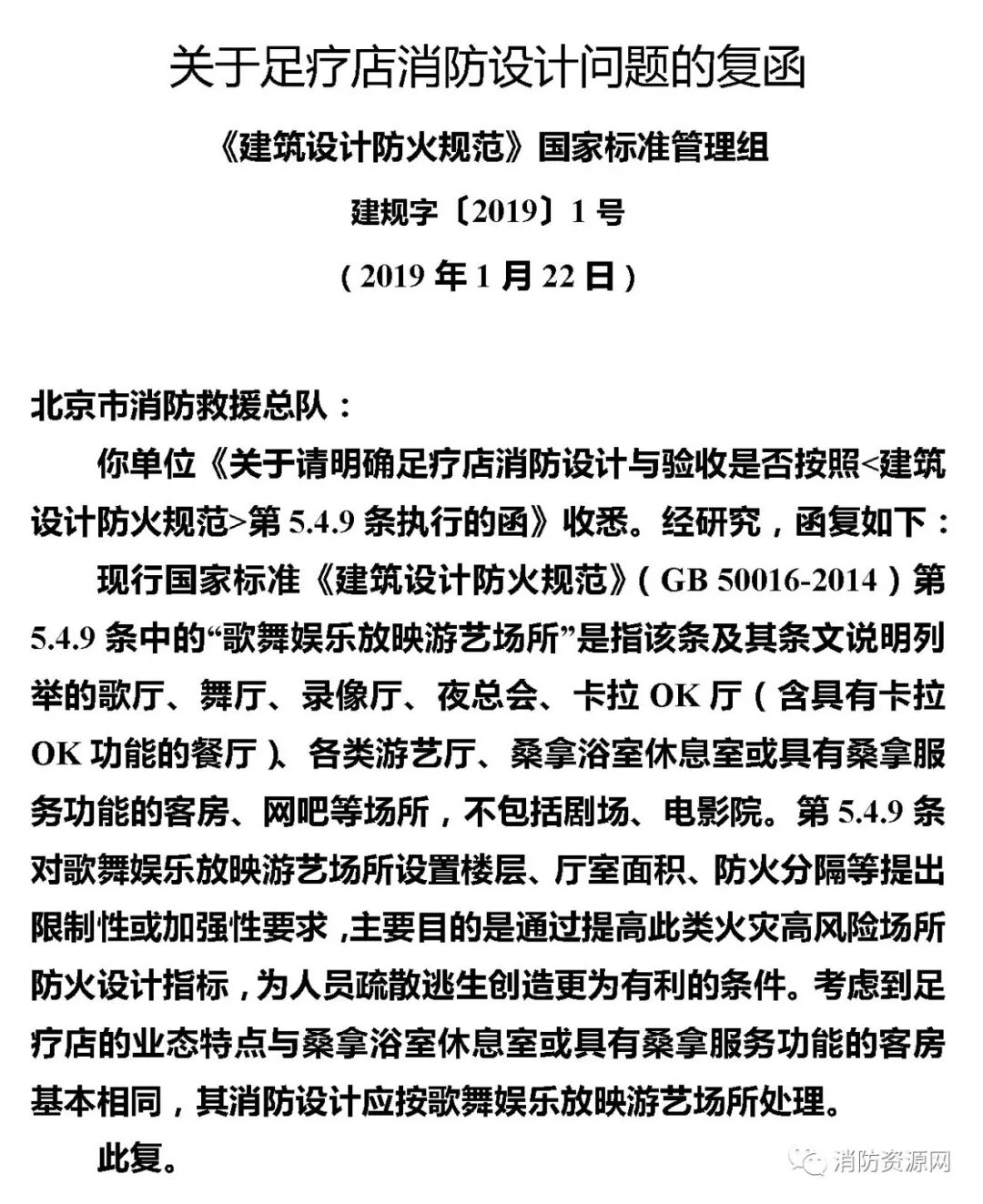 根据《建筑设计防火规范》国家标准管理组《关于足疗店消防设计问题的复函》(建规字〔2019〕1号)要求:现行国家标准《建筑设计防火规范》(GB 50016-2014)第5.4.9条中的“歌舞娱乐放映游艺场所”是指该条及其条文说明列举的歌厅、舞厅、录像厅、夜总会、卡拉OK厅(含具有卡拉OK功能的餐厅)、各类游艺厅、桑拿浴室休息室或具有桑拿服务功能的客房、网吧等场所(不包括剧场、电影院)。第5.4.9条对歌舞娱乐放映游艺场所设置楼层、厅室面积、防火分隔等提出限制性或加强性要求,主要目的是通过提高此类火灾高风险场所防火设计指标,为人员疏散逃生创造更为有利的条件。考虑到足疗店的业态特点与桑拿浴室休息室或具有桑拿服务功能的客房基本相同,其消防设计应按歌舞娱乐放映游艺场所处理。