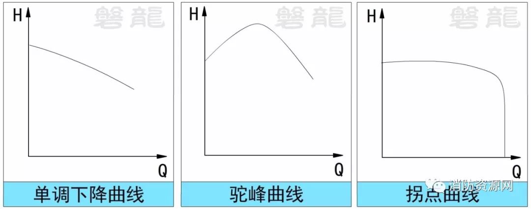 四、在消防水泵的选型应用中,不能采用性能曲线单调下降的水泵、不能采用性能曲线呈驼峰形的水泵、不能采用性能曲线有拐点的水泵。