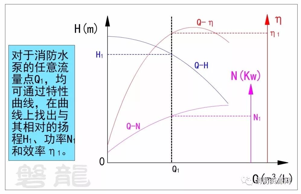 二、对于消防水泵的任意流量点,均可通过特性曲线,在曲线上找出与其相对的扬程、功率和效率。