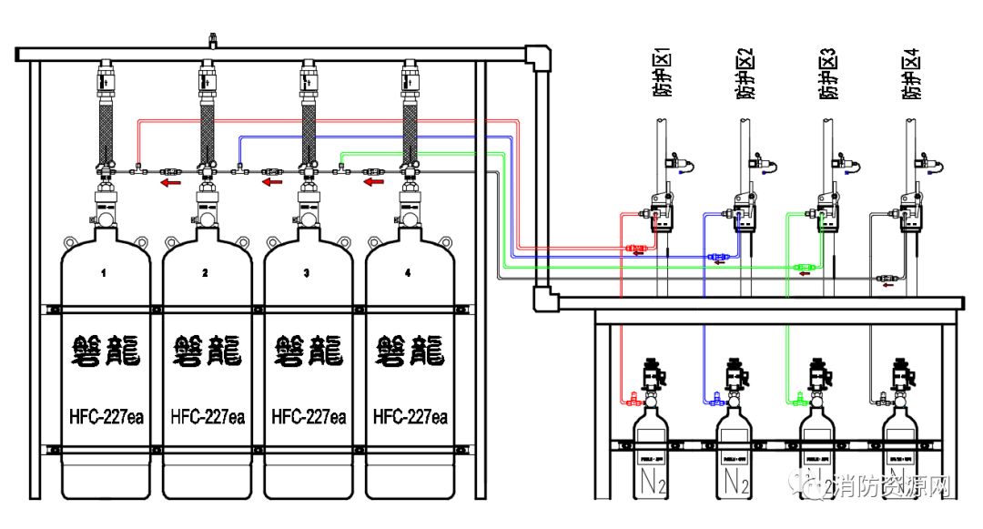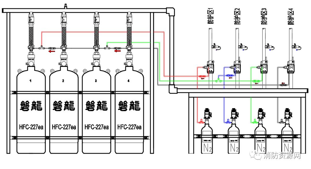 2、以上示例,为方便理解,防护区选择阀依灭火瓶组开启数量从右至左逐级变大,实际应用中,排序可能有所不同,可适时调整。但是,应鼓励设计施工图尽量按此原则设计,以利安装和使用。