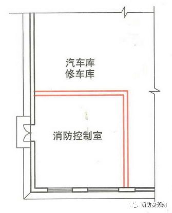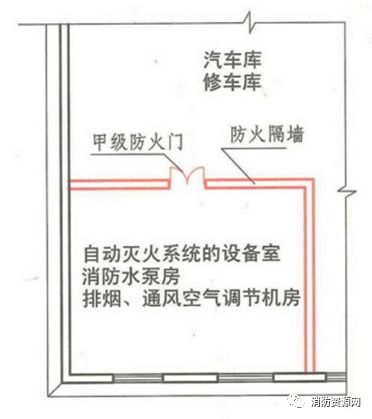 附设在汽车库、修车库内,且主要为其服务的消防控制室、自动灭火系统的设备室、消防水泵房和排烟、通风空气调节机房等,应采用防火隔墙和耐火极限不低于1.50h的不燃性楼板相互隔开或与相邻部位分隔,部份设备室的疏散门可以向汽车库或修车库开启,详见图示5.1.9。