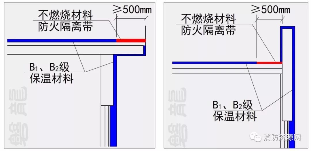 三、建筑的屋面和外墙外保温系统均采用B1、B2级保温材料时,屋面与外墙之间应采用宽度不小于500mm的不燃材料设置防火隔离带进行分隔。