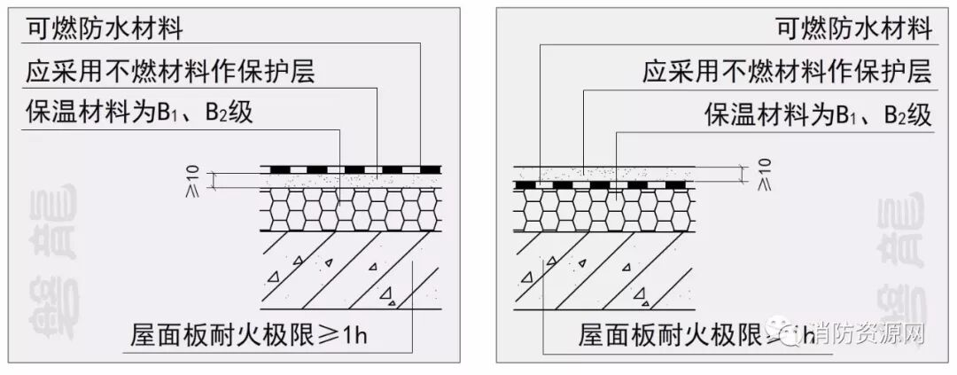 一、建筑的屋面外保温系统,当屋面板的耐火极限不低于1.00h时,保温材料的燃烧性能不应低于B2级;当屋面板的耐火极限低于1.00h时,不应低于B1级。采用B1、B2级保温材料的外保温系统应采用不燃材料作防护层,防护层的厚度不应小于10mm。